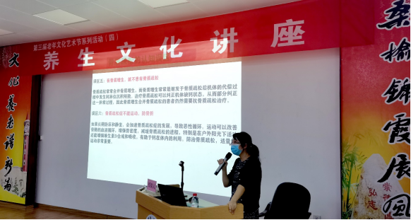 10月26日下午,学校第三届老年文化艺术节系列活动之——养生文化讲座在离退休人员服务中心会议室举行。湛江中心人民医院老年病科专家吴肖萍医生给现场60余名离退休教职工作了主题为“骨质疏松症预防与保健”的讲座。讲座由离退休人员服务中心党委书记、主任欧海清主持。