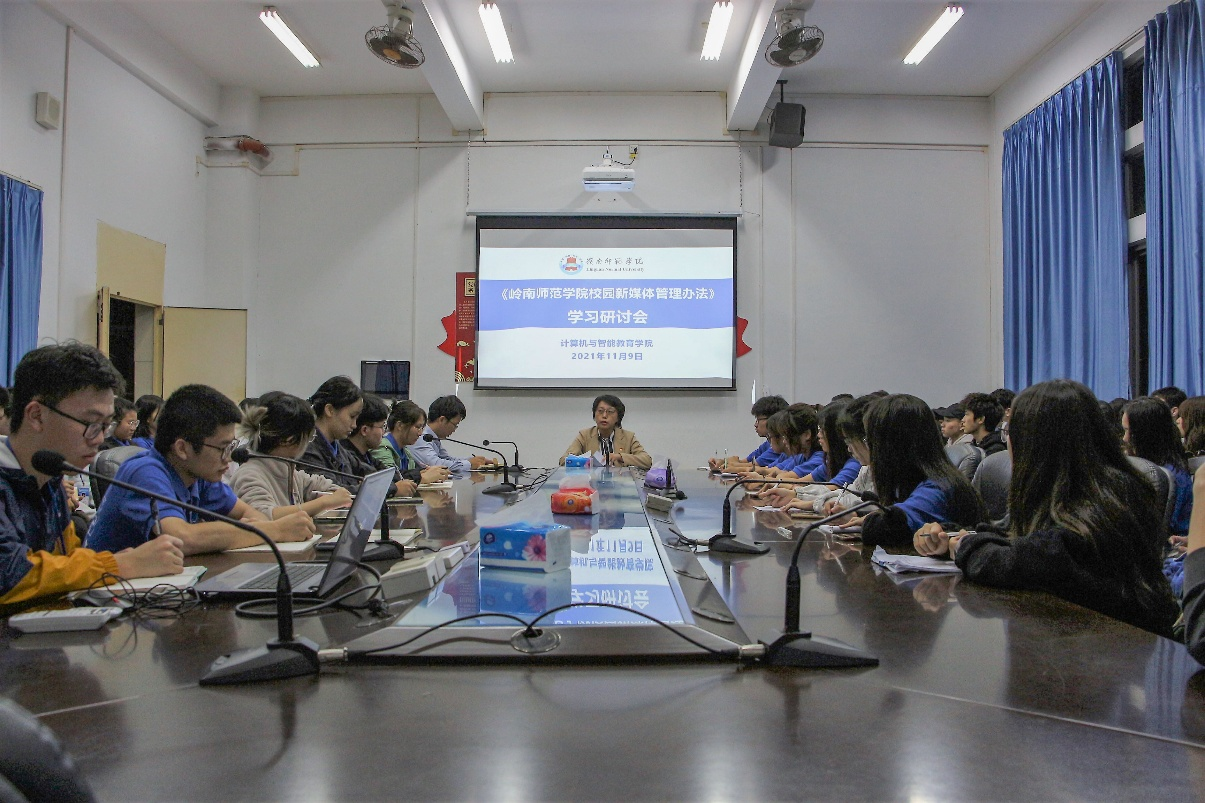 11月9日下午,计算机与智能教育学院召开宣传思想工作暨《岭南师范学院校园新媒体管理办法》学习研讨会,学院党委副书记陈明娟,副科级组织员、辅导员、宣传中心指导老师刘利丹,学院宣传中心全体学生干部、易班中心学生干部代表、学院各班宣传委员参加了会议。刘利丹主持会议。