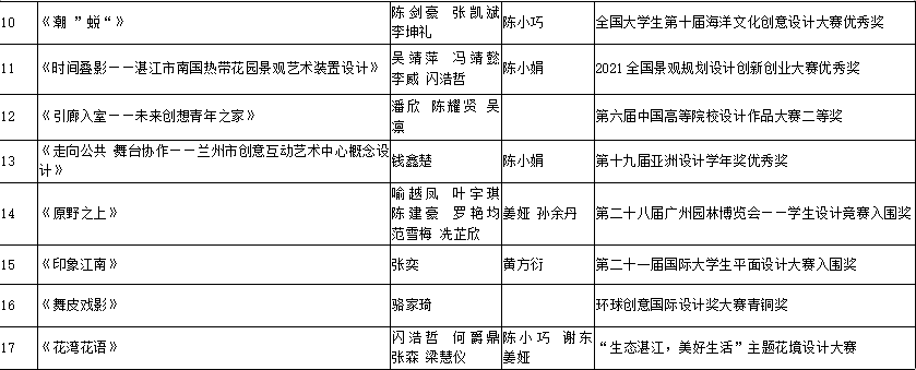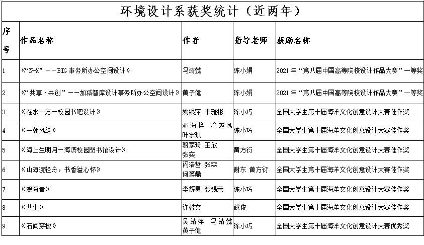 今年9月,吴靖萍、冯靖懿、李威、闪浩哲4名同学作品《时间叠影——湛江市南国热带花园景观艺术装置设计》获得“2021全国景观规划设计创新创业大赛”中取得的优秀奖;今年10月,由姚银萍、邓海换、骆家琦、闪浩哲、李辉勇、许馨文等14名同学在陈小巧、谢东、黄方衍等老师的指导下在全国大学生第十届海洋文化创意设计大赛上取得的6个佳作奖。众多的获奖成果展示了环境设计专业 “以赛促学、以赛促改”的教学模式成效显著。