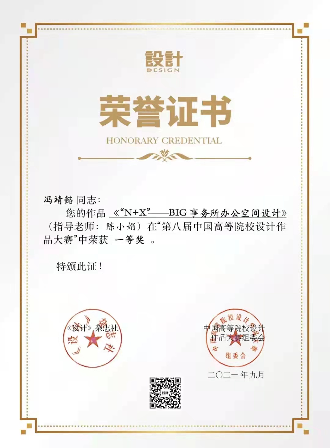 近日,美术与设计学院环境设计系再传喜讯,在刚刚落幕的2021年“第八届中国高等院校设计作品大赛”暨《中国高等院校设计作品精选年鉴(2021卷)》上,2018级冯靖懿、黄子健两位同学分别获得一等奖和三等奖。近两年来,环境设计系推进“以赛促学”的教学模式,指导学生获奖17项。