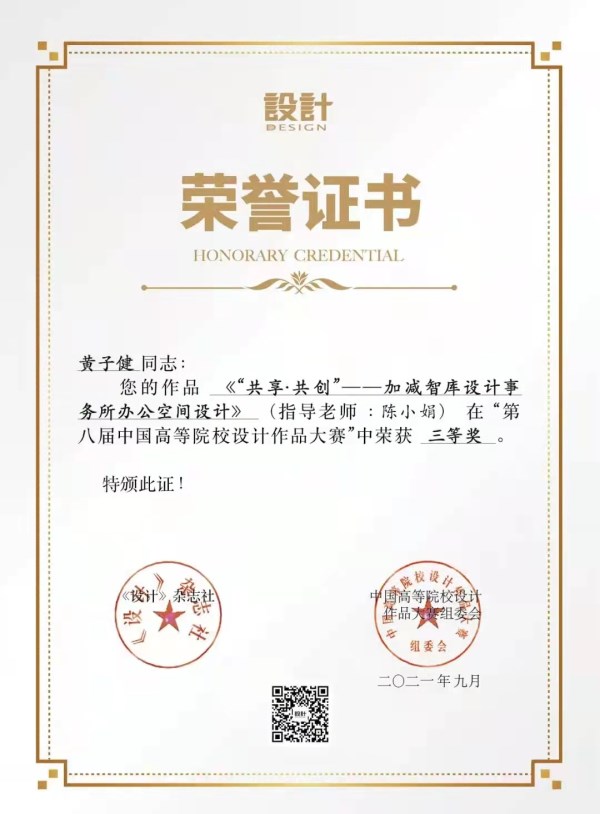 “这次获奖的两件作品是产学研教学体系探索的最新成果。”指导老师陈小娟介绍,冯靖懿同学获奖作品《“n+x”——big事务所办公空间设计》为 big 建筑事务所的办公空间。黄子健同学获奖作品《“共享·共创”——加减智库设计事务所办公空间设计》旨在利用有限的空间,体现办公状态下人与人、人与空间的共享。通过以课程培训为中心,有计划地组织和引导学生参加相关技能竞赛,使学生将其在课堂教学中掌握的各项技能付诸于实践,更能有效提升学生的学习兴趣和学习效果。