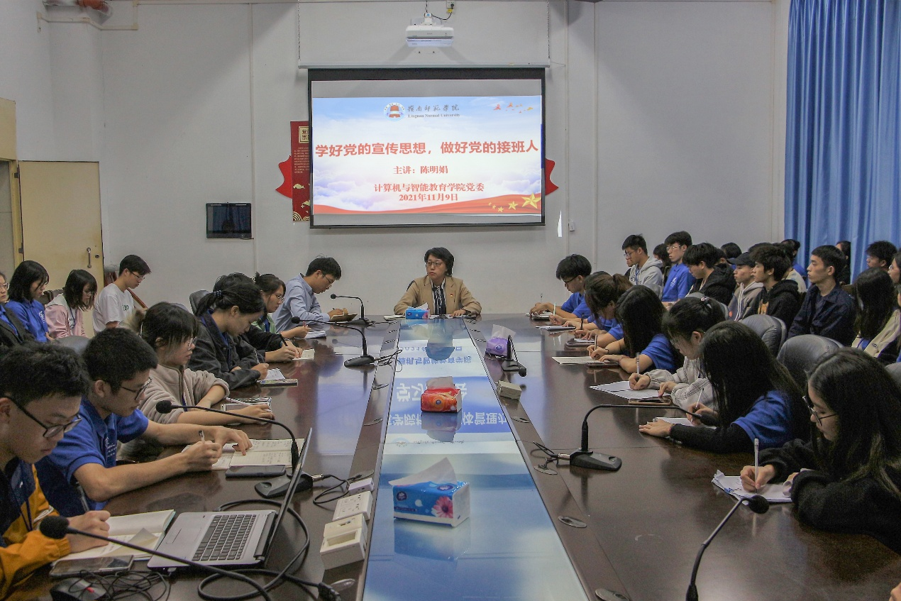 11月9日下午,计算机与智能教育学院召开学工干部党史学习教育宣讲团宣讲活动,学院党委副书记陈明娟,副科级组织员、辅导员刘利丹,学院2019级、2020级、2021级各班级学生代表参加了会议。刘利丹主持会议。