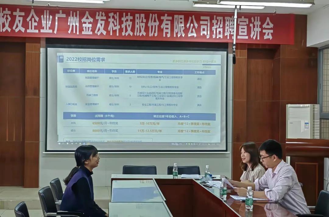 本期招聘会应邀参加的是来自广州的校友企业金发科技股份有限公司,该公司是化学化工学院1981届化学专业毕业校友袁志敏、李南京创办的一家聚焦高性能新材料科研、生产、销售、服务,为创造更加安全、舒适、便捷的人类生活提供全新材料解决方案的新材料企业。公司总部位于广州科学城,旗下拥有46家子公司,在南亚、北美、欧洲等海外地区设有研发和生产基地。该公司产品以自主创新开发为主,覆盖了改性塑料、完全生物降解塑料、特种工程塑料、碳纤维及复合材料、轻烃及氢能源和医疗健康高分子材料产品等六大类自主知识产权产品,以其良好的环境友好度和卓越的性能远销全球130多个国家和地区,为世界1000多家知名企业提供产品支持服务。
