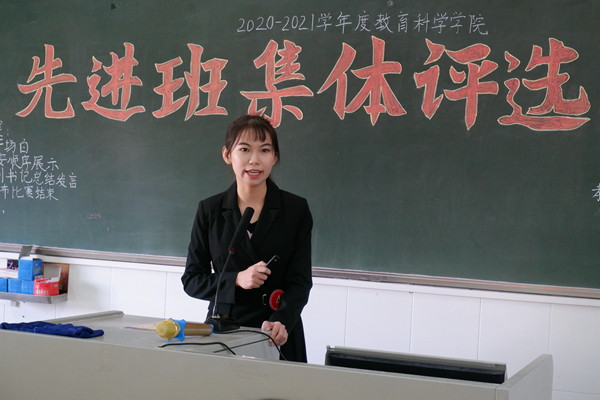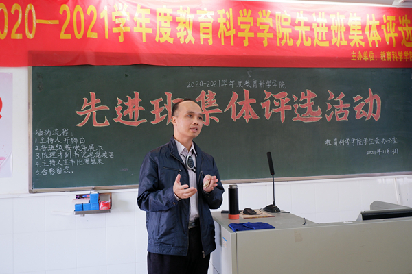 为了加强班级间的交流与联系,激发同学们的学习热情,促进同学们全面发展。11月13日上午,教育科学学院于教四801开展2020-2021学年度先进班集体评选活动。教科院党委副书记陈理才、辅导员李水清、朱丽儒和八大学生机构代表及外院嘉宾共同出席了本次活动。
