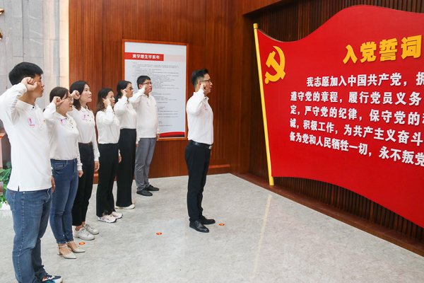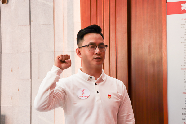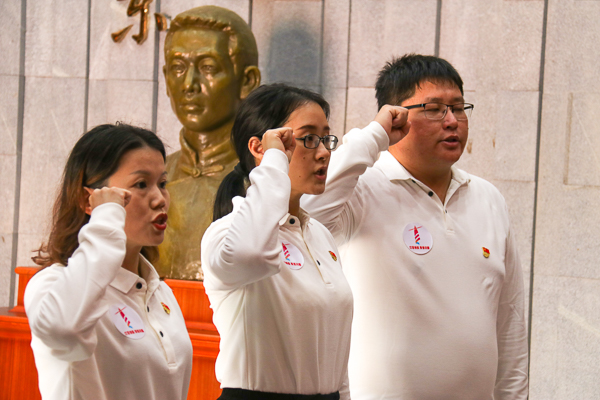 黄学增于1900年出生在广东省遂溪县,他是广东四大农民运动领袖之一,也是南路地区第一位中共党员。1962年周恩来总理到湛江视察时指示建立了黄学增故居。走进黄学增纪念亭,位于亭中央的黄学增烈士半身铜像,在“星星之火,可以燎原”八个大字映照下,格外庄严肃穆、熠熠生辉。面对牺牲时年仅29岁的革命先烈,全体党员肃然起敬,向黄学增烈士进行了三鞠躬。“我志愿加入中国共产党,拥护党的纲领,……”面对鲜艳的党旗,全体党员举起右手紧握成拳,在林仲彦的领誓下,重温了入党誓词。