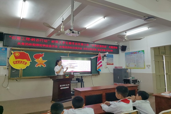 11月17日上午,外国语学院“培根”宣讲团在湛江市第十五小学五楼多媒体教室举行了党史宣讲会,此次宣讲由邓静菊、由思扬主讲,湛江市第十五小学3名老师及112名五年级学生参加了此次宣讲会。