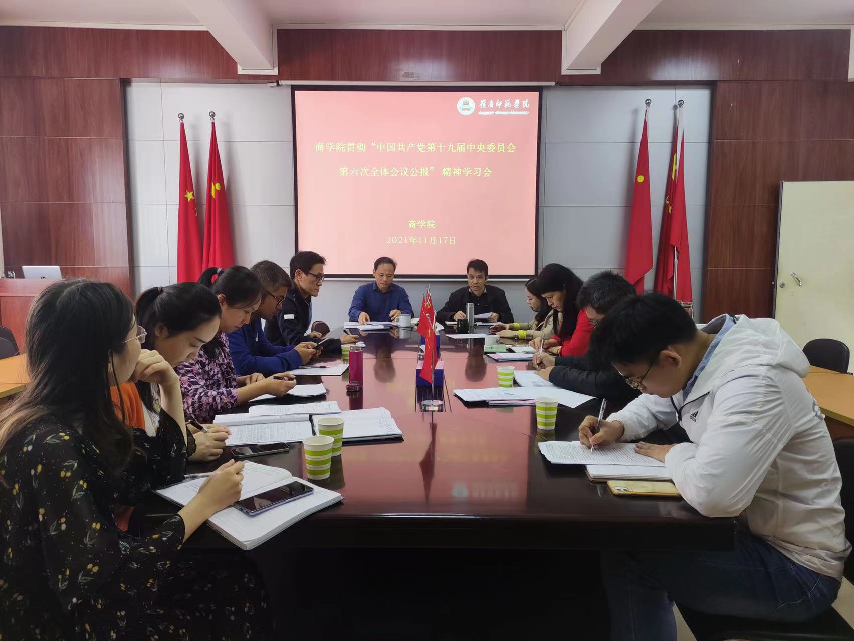 何等浩指出,这次全会是在“两个一百年”奋斗目标历史交汇的重要时刻,召开的一次具有全局性、历史性意义的重要会议。我们要从战略和全局的高度深刻认识党的十九届六中全会的重大意义,充分认识党带领人民不懈奋斗所取得的伟大成就,不断提高政治判断力、政治领悟力、政治执行力;要深刻认识习近平新时代中国特色社会主义思想对于全党统一思想、统一意志、统一行动,开启全面建设社会主义现代化国家新征程具有重大意义,增强“四个意识”、坚定“四个自信”,做到“两个维护”;要深刻把握党的第二个百年奋斗目标的要求,不忘初心,牢记使命,把党的第二个百年奋斗目标与学院发展实际相结合,将“为党育人、为国育才”的目标任务落到实处。何等浩强调,商学院领导班子及各党支部书记要带头深刻学习领会党的十九届六中全会精神,切实增强学习贯彻六中全会精神的政治自觉,迅速掀起学习贯彻热潮,切实用六中全会精神武装头脑、指导实践、推动工作。