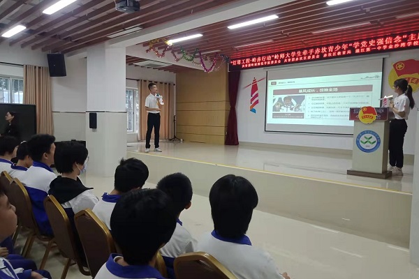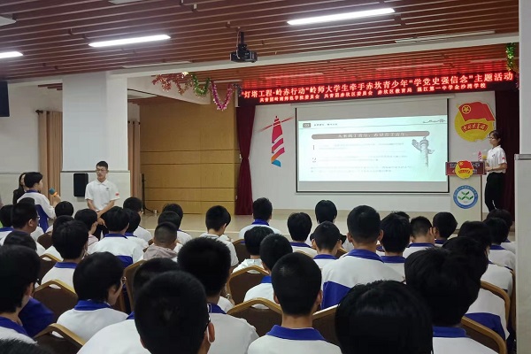 11月22日下午,岭南师范学院大学生“培根”宣讲团赴湛江一中金沙湾学校,面向初二年级290余名学生举办以“做新时代有为青年”为主题的宣讲活动。此次宣讲会由外国语学院19商务英语4班的肖年儿以及计算机与智能教育学院20教育技术学1班的刘姿利主讲。