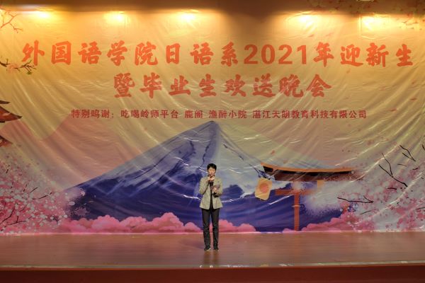 11月26日下午,外国语学院在音乐厅举办外国语学院日语系2021年迎新生暨毕业生欢送晚会。出席本次晚会的有,日本阪田油墨有限公司(茂名)社长石井素功先生一行、外国语学院党委陈永国书记、主持行政全面工作的吴晓春副院长、杨建伟副书记、周扬副院长、曹耀萍副院长、陈湛妍副院长以及日语系全体师生。