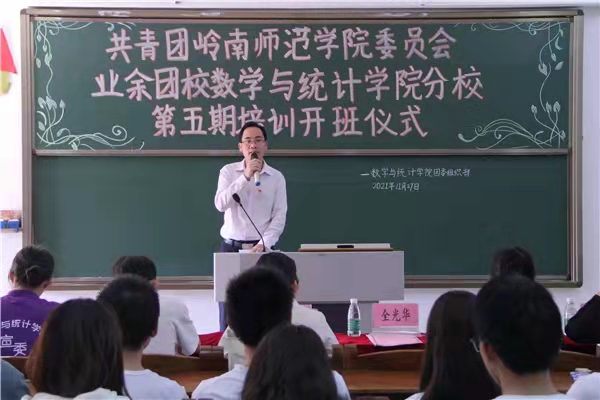 全光华致辞,他表示这次培训是一次十分难得的学习机会,有利于提高学生干部的思想觉悟,塑造学院学生干部的良好精神风貌,培养各学生干部的责任与担当,助力学院做好新时代共青团工作。由此,他提出了四点意见,一是正确认识参加团培的重要意义;二是增强学生干部集体的凝聚力;三是理解百年奋斗的历史意义,从中汲取智慧和力量;四是用青春奋斗致敬百年党史,永远紧跟党的步伐。同时,全光华强调同学们要深入学习贯彻党的十九届六中全会精神、学习习近平总书记“七一”重要讲话精神,勉励同学们严格要求自己,提高自身修养,努力成为能担当民族复兴大任的新时代青年。