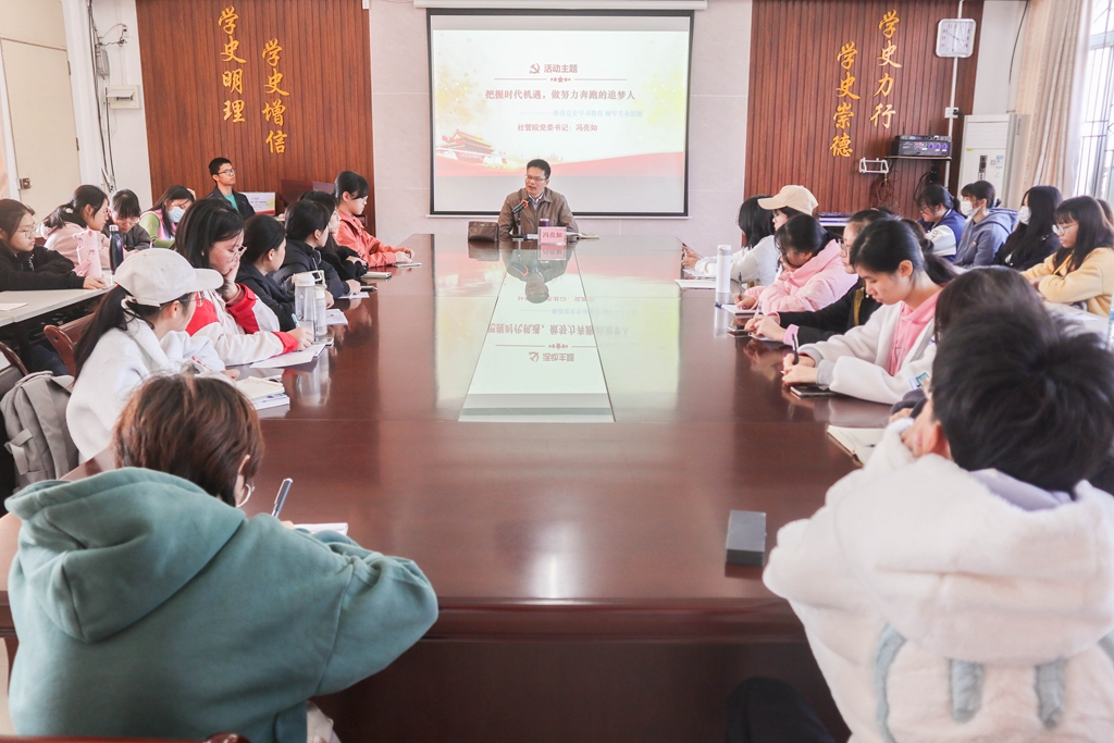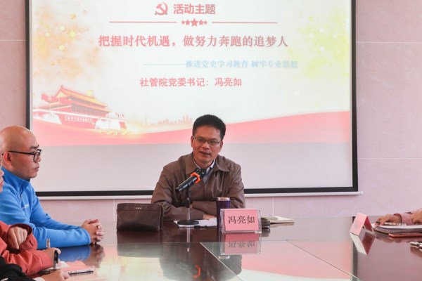 为深入了解学生思想、学习、生活情况,及时为学生解决困难和各种具体问题,开展“心心向荣”为学生办实事系列活动,持续推进党史学习教育、深入开展巡视整改,进一步探索“三全育人”长效机制,12月1日,社会与公共管理学院于弘雷楼313室启动“心桥”主题教育:党委书记“进班级、讲党史、树学风”系列活动。社管学院党委书记冯亮如为21级社会工作1班学生做以“把握时代机遇,做努力奔跑的追梦人”为主题的讲座。该院党委副书记邓蔚婵、辅导员何一明、李从来老师出席活动。