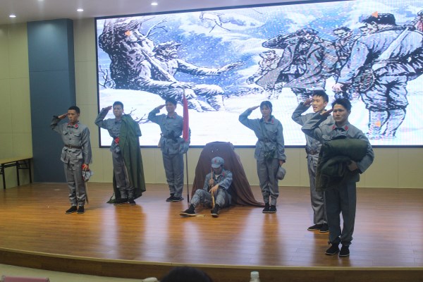 精品传千古,经典咏流传。《丰碑》这一课文讲述了一支红军队伍在冰天雪地里艰难前行时,军需处长把自己的棉衣让给了战友,自己却被严寒冻死的感人故事。《丰碑》剧组采用了老红军回忆往事的方式,向观众演绎这个感人至深的故事。演员袁圣冠分饰两角,饰演开场的老红军和小军需官,通过精巧的舞台设计和灯光效果,在两个角色间巧妙转换,将两个角色表演得淋漓尽致、惟妙惟肖。在结尾处,饰演红军的演员胡政随着全体的合唱慢慢挥旗,他立定在前、双手紧握旗子,展现了红军战士志气昂扬的坚定神态。全体的合唱更是渲染了现场的气氛,悲壮万分。歌声带动观众穿梭时空,感受红军的困难,体会红军的艰辛。《丰碑》剧组用壮烈的歌声和动容的表演感染了现场的评委和观众,获得好评如潮。