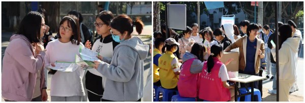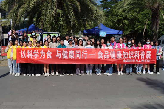 “以科学为食,与健康同行”主题的食品科普展于体育馆前东南侧处举行,参加活动的嘉宾有食品科学与工程学院辅导员姚其元和袁嘉渝。