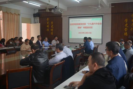 12月15日下午,法政学院于弘雷楼313室召开学习贯彻党的十九届六中全会精神宣讲会。法政学院领导班子、各系主任、各教工党支部书记、教职工等参加了本次会议。会议由法政学院党委书记李德深主持。
