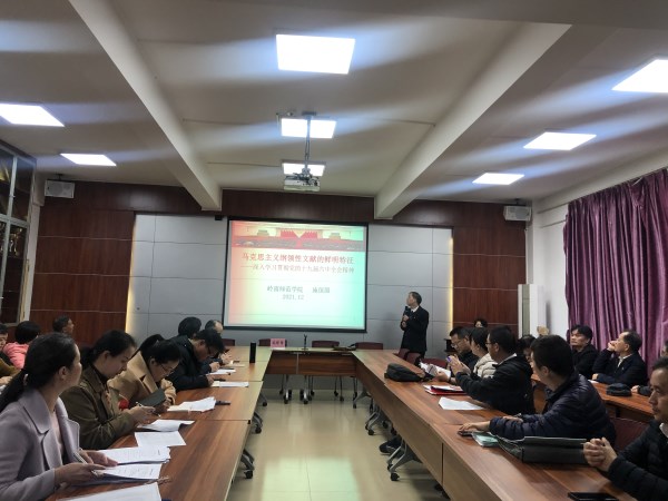 12月20日下午,教育科学学院在教四c-408室举行党的十九届六中全会精神宣讲会。宣讲会由马克思主义学院副院长施保国教授主讲,学院全体教职员工参加了宣讲会。