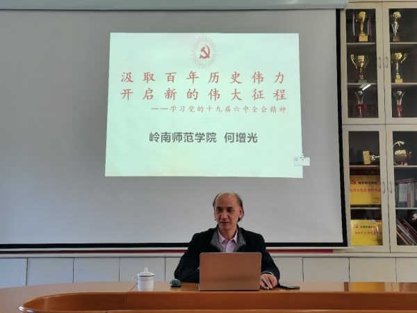 12月21日下午,物理学院开展党的十九届六中全会精神专题辅导报告会,邀请学校党委党史学习教育宣讲团成员、马克思主义学院院长何增光作宣讲报告,学院全体教职工参加,学院党委书记陈碧琼主持。