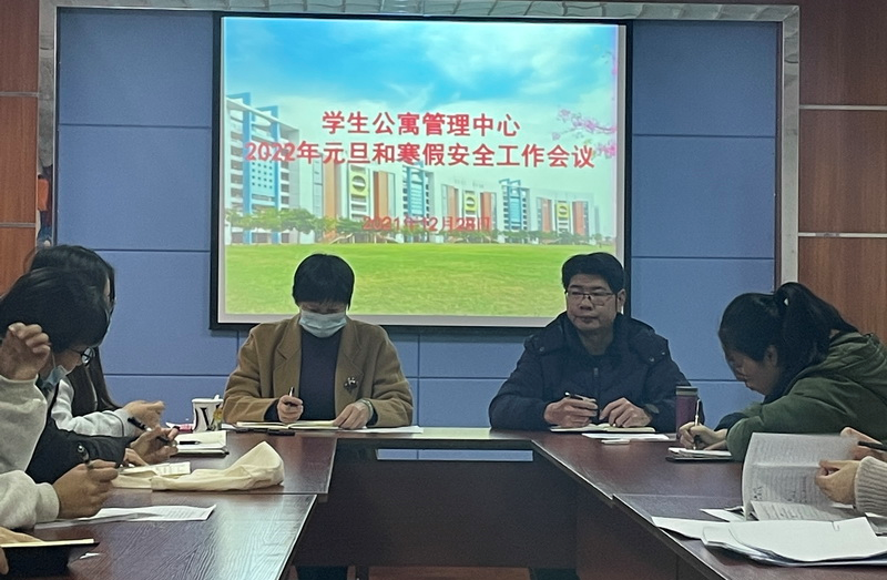 12月28日,学生公寓管理中心召开安全工作专项会议,部署2022年元旦及寒假安全工作。会议由学生公寓管理中心主任胡再妍主持,公寓中心全体管理人员参加会议。