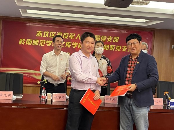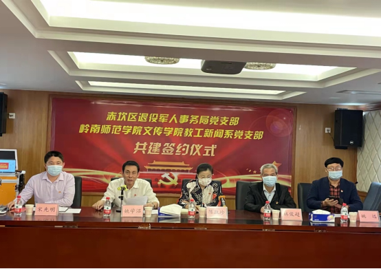 赤坎区直工委书记林俊超、赤坎区退役军人事务局党组书记、局长姚学沼、赤坎区退役军人事务局党支部书记宋先明、岭南师范文学与传媒学院党委书记陈凯珍、党委副书记梁碧斐、新闻系党支部书记姚远以及双方党支部其他成员共同参加了“结对共建”签约仪式。
