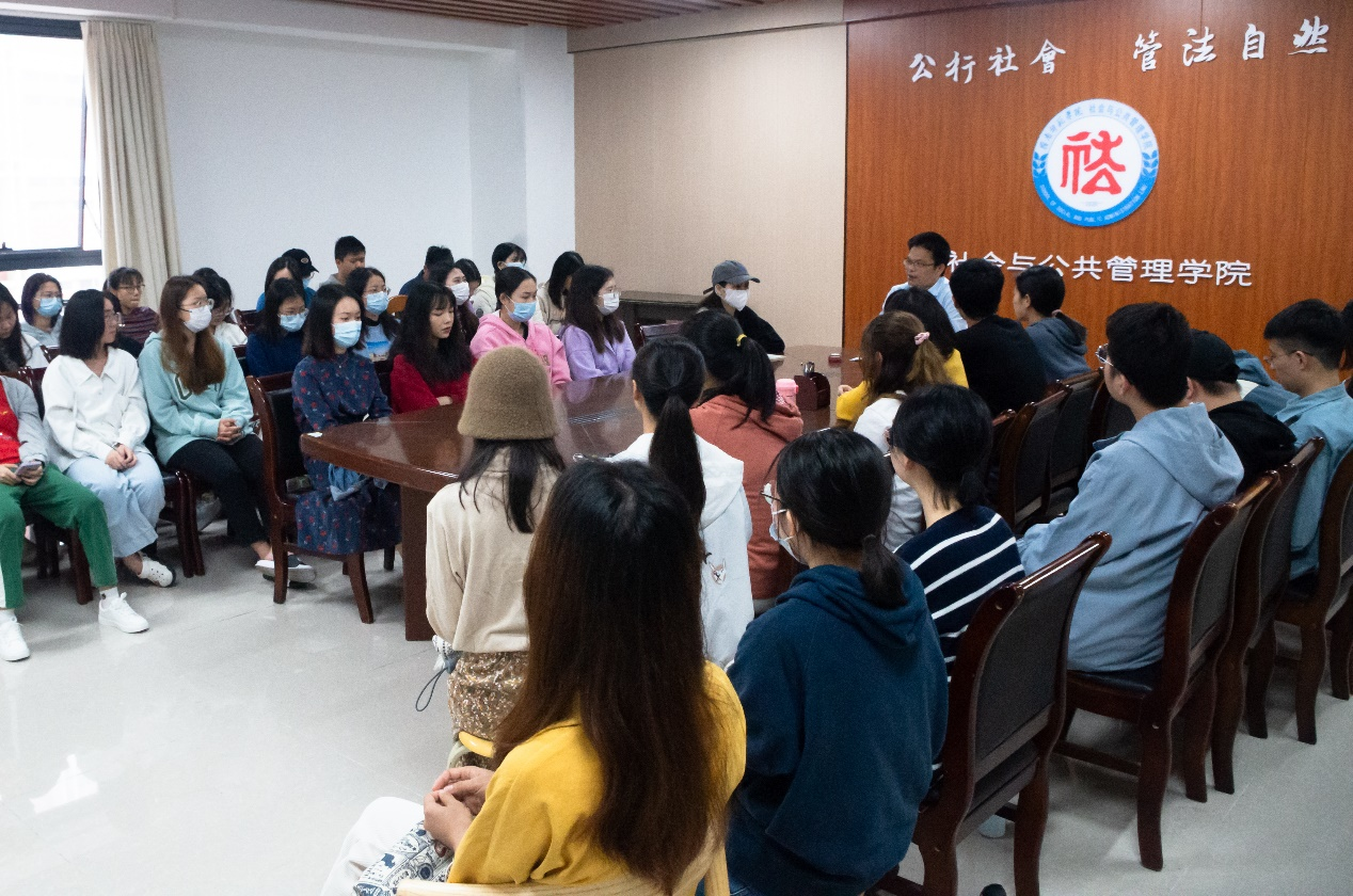 在座谈交流环节,同学们交流了思想和学习心得,并谈及当前专业学习情况和未来发展规划问题。冯亮如向同学们介绍了社会工作专业的发展前景和就业形势,建议同学们要充分认识到社会工作专业的重要社会价值,积极投身社会实践,树立自信、增强信心,提高本领、服务社会。针对同学们面临考研、就业、创业的选择问题,冯亮如鼓励同学们做好长远的人生规划,坚持多元发展和分阶段实施。对有考研想法的同学,冯亮如建议要尽早确定考研目标院校,系统梳理和深化专业知识学习。他还结合历年优秀师兄师姐成功就业和创业的例子,鼓励同学们积极就业创业。