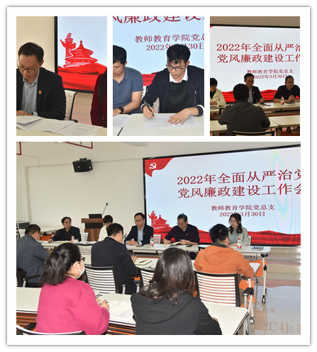 为贯彻落实全面从严治党主体责任,深入推进党风廉政建设,3月30日下午,教师教育学院党总支于五教a612室召开2022年全面从严治党暨党风廉政建设会议。学院党总支书记练有扬传达了学校有关会议精神,总结部署学院全面从严治党暨党风廉政建设工作。王林发院长主持会议。