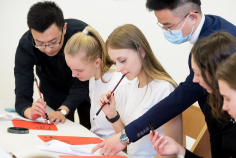 孔院教师马佳豪教授书法大师课,带学生学习了书法基本笔画,并通过“你好”“中国”“白俄罗斯”“朋友”“友谊”等汉字进行书法练习。学生们劲头十足,横竖撇捺,一笔一画,十分认真。教室里的墨香味沁人心脾,学生们跟同伴互相展示作品,十分骄傲。
