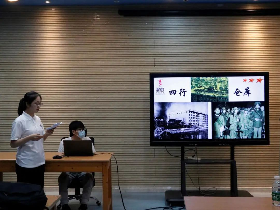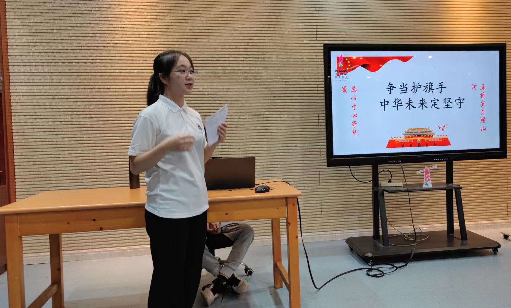 其次她向大家分享了她的感受,参加四行仓库保卫战的战士是以血肉之躯誓死坚守,他们坚守的每一分钟都彰显着中华民族宁死不屈的气节。我们身为当代有志青年要铭记前辈的牺牲,继承肩负起每个时代的使命。她表示,习近平总书记高瞻远瞩,指出中国未来属于青年,希望寄予青年。在中国共产党的领导下,一代代中国青年把青春奋斗融入党和人民事业,爱国主义就流淌在中华民族血脉之中,去不掉、打不破、灭不了。“愿以寸心寄华夏,且将岁月赠山河”, 我们身为中华儿女都生在红旗下,长在春风里。争当护旗手,中华未来定坚守。