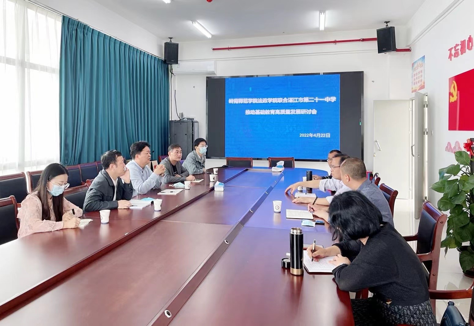 为全力推进《岭南师范学院赋能基础教育高质量发展行动方案》,4月22日上午,法政学院党委书记李德深、副院长娄伟、历史系副主任兰教材、思政系主任谢锦江、辅导员孟玉新等人赴湛江市第二十一中学开展基础教育高质量发展专项调研。本次调研活动以座谈会的形式开展,法政学院一行以及湛江市第二十一中学校长林文明等参加了座谈会。