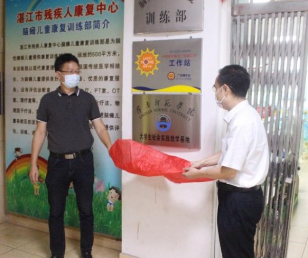 仪式上,湛江市残联副理事长陈志鸿与岭南师范学院教育科学学院副院长李继波共同为“岭南师范学院大学生社会实践基地”揭牌。