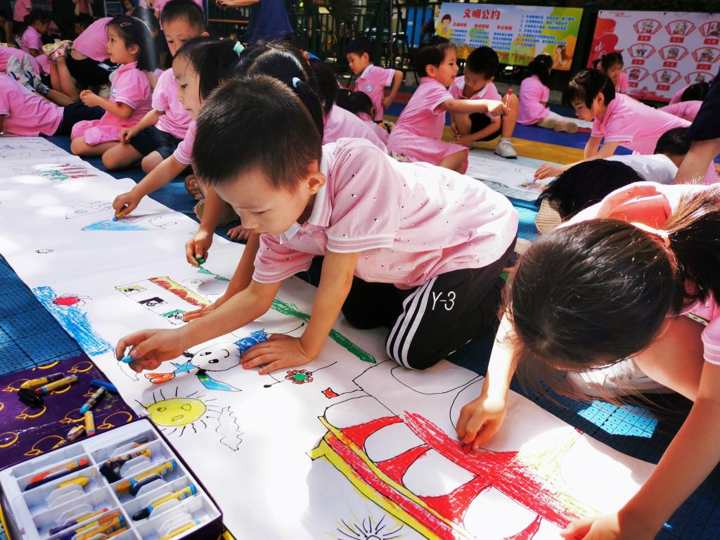 “童心向党,喜迎二十大”,全园410名幼儿拿出手中的画笔即兴挥毫。用绚丽的色彩绘出伟大的祖国,孩子们以自己独特的方式表达了对党的热爱之情,将红色种子深深植根于心间。
