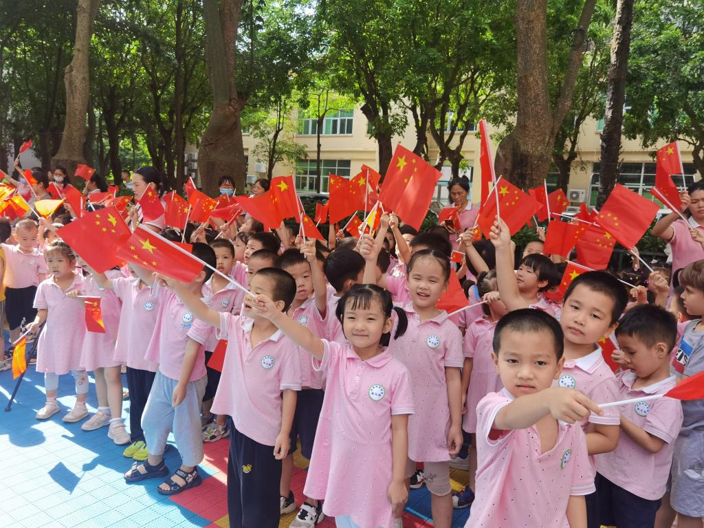 孩子们挥动着手中的国旗,师生高唱《我和我的祖国》《没有共产党就没有新中国》,嘹亮的歌声响彻校园。