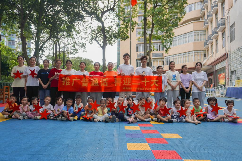 活动在《中国娃》的齐声朗诵中拉开帷幕,“五十六个民族我们是—家,祖国是根我是花,祖国的明天靠我们中国娃。”岭师幼儿园的小朋友们在大学生们的带领下用标准的普通话,声情并茂地朗诵了这首儿童诗歌。老师们手打节拍,大学生们做起整齐划一的手部动作,带领着小朋友们共同朗诵了诗歌《国旗国旗真美丽》。“祖国前进,我长大。向着国旗敬个礼,敬个礼!”小朋友们的手高高地举过头顶,目光坚定而有力地看向前方。幼儿园操场上,五星红旗高高飘扬,大学生与学龄儿童清脆激昂的声音交织在一起,以动人的普通话朗诵向祖国传递了最诚挚的爱。