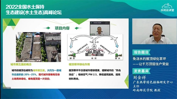 双创学院刘金祥教授应邀参加论坛并做主题报告:免浇水的屋顶绿化草坪——让千万顶层住户受益。他首先介绍了项目的研究背景,党的十八大、十九大报告都十分关注生态文明,重视美丽中国建设,习近平总书记指出,山水林田湖草沙是生命共同体,凸显了小小草、大生态的新时代特征。