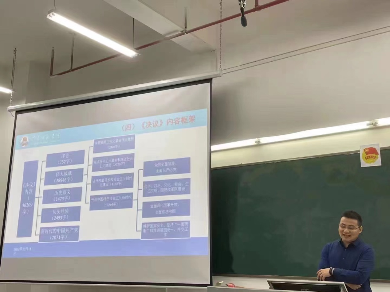 10月11日晚,社管学院院长张勇教授于教五A-103室为22级行管班开讲“思政第一课”, 他从学习贯彻党的十九届六中全会精神出发,带领同学们深入学习习近平新时代中国特色社会主义思想。