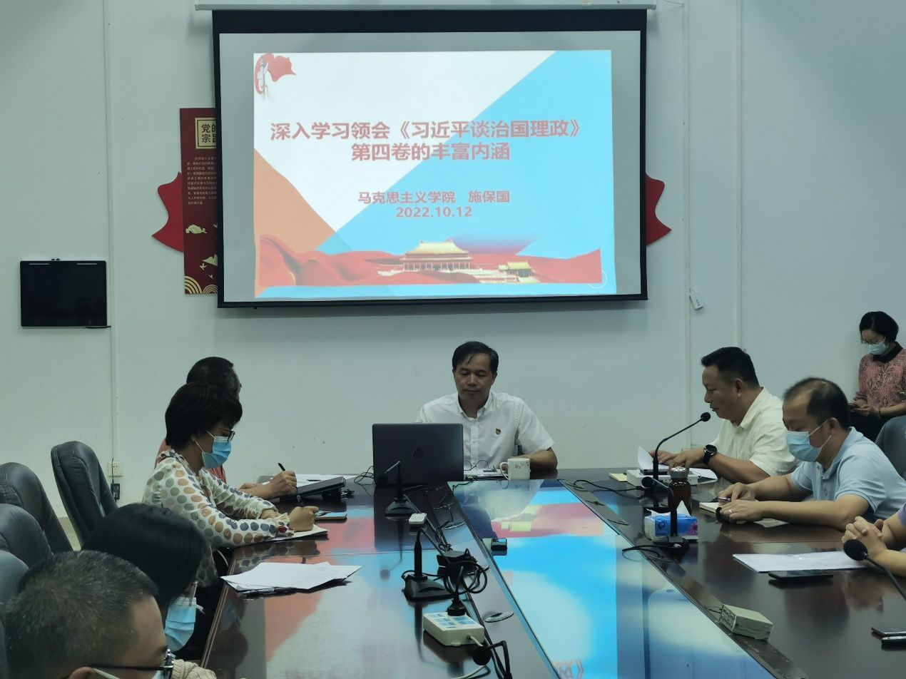 10月12日下午,学校马克思主义学院副院长施保国教授在综B101会议室为计算机与智能教育学院全体教职工作了《深入学习领会<习近平谈治国理政>第四卷的丰富内涵》专题辅导报告。会议由学院党委书记李海文主持。