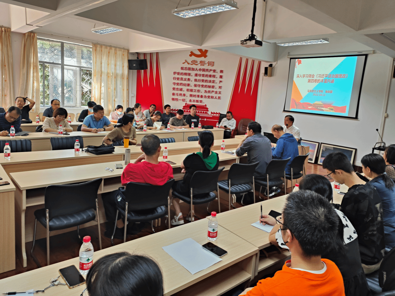 10月13日,马克思主义学院举办学习《习近平谈治国理政》第四卷辅导报告会。学院副院长施保国出席会议,领导班子和全体教职工参加学习,会议由院长何增光主持。