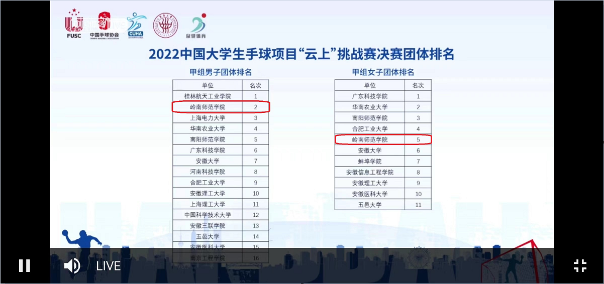 11月13日,2022年中国大学生手球项目“云上”挑战赛决赛以线上直播的形式举行。岭南师范学院代表队(男子、女子甲组)团结协作、众志成城,在激烈的竞争中杀出重围,获得了男子团体积分榜第二名、女子团体积分榜第五名。在个人单项中,有9名运动员进入决赛,并获得了“两金一银一铜”的好成绩。