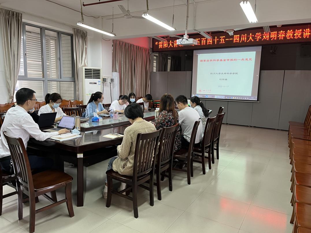 2022年11月17日上午,“雷阳大讲坛”之第五百四十五专题讲座在生命科学与技术学院会议室召开,四川大学生命科学与技术学院博士生导师刘明春教授受邀作了题为《国家级课题申报心得体会》的专题讲座。生命科学与技术学院院长刘锴栋教授、副院长王锂韫教授及生命科学与技术学院学术骨干参加了讲座。