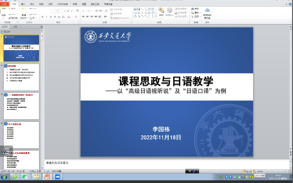 李国栋则带来了以“高级日语视听说”及“日语口译”为例的课程思政与日语教学的讲座。讲座以课程思政应做到“有的放矢”、高级日语视听说课堂设计及组织实施、将口译课直接搬到国际会议现场、日语在国际传播中发挥的作用、日语教学未来展望为主要内容展开演讲。在讲座中,李国栋以身边的学生为例指出需要加强学生的学习能力,从多方面锻炼学生,培养学生的兴趣爱好,这样才能培养出优秀的学生。