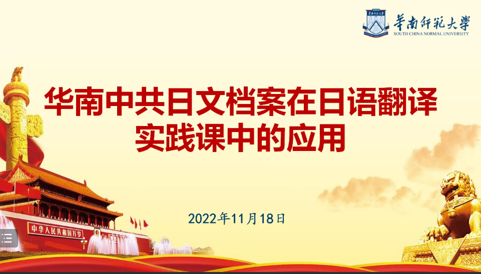 吴佩军在教研探讨中,为参会人员带来了以“华南中共日文档案在日语翻译实践课程中的应用”为题的讲座。讲座围绕党史资料进课堂的背景、党史资料在日语翻译教学实践中的应用、日语翻译教学改革的成果、华南师范大学“新日语学科”战略、课程思政的“四个融入”等方面进行了详细的讲解。吴佩军在发言过程中强调了史料收集翻译的方法、学生科研能力的培养方式,特别指出在使用历史资料时要辨别考证资料的真伪,在翻译过程中要尽可能地了解历史背景。