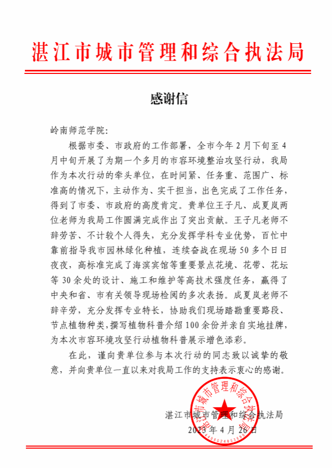 4月26日,湛江市城市管理和综合执法局给学校发来感谢信,对生科院两位专家王子凡、成夏岚在一个多月的市容环境整治攻坚行动中做出的重要贡献表达了感谢和敬意。