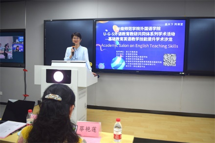 4月28日,外国语学院在教五A514室举办岭南师范学院U-G-S外语教育教研共同体系列学术活动-基础教育英语教学技能提升学术沙龙。会议以岭南师范学院智慧教室为线下主会场,同时借助湛江市一体化的课堂平台,联通湛江市第二十五小学等多个线上分会场,在线上线下同时开展了此次活动。参会人员有湛江市教育局教研室副主任蔡艳莲,华南师范大学外国语言文化学院副院长徐曼菲教授,广州花都区教师发展中心教研员庄海滨老师,湛江第一中学广东省名教师工作室主持人陈晓君老师,岭南师范学院U-G-S外语教育教研共同体成员,英语师范专业的学生,以及岭南师范学院附属中学、开发区第一中学、党民中学、爱周高级中学的12位教师代表和线上5000多人。会议第一环节由外国语学院副院长吴晓春(主持行政全面工作)主持。由广东省出版集团数字出版有限公司湛江市一体化课堂平台提供技术支持。