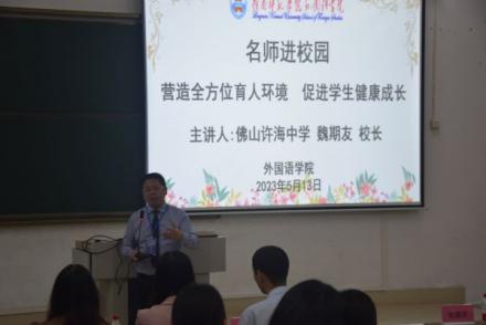 5月13日晚上,外国语学院在第三教学楼311室开展“名师进校园”讲座活动,该活动也是2023年岭南师范学院“新师范”建设学术论坛活动之一。本次活动邀请优秀校友佛山许海中学党委支部书记、校长魏期友、教导处主任王才海、七年级主任郑学霓(主管行政)、七年级级长陈婉灵为外国语学院英语系学生开讲。外国语学院副院长曹耀萍出席本次会议,会议由英语系主任古永辉主持。
