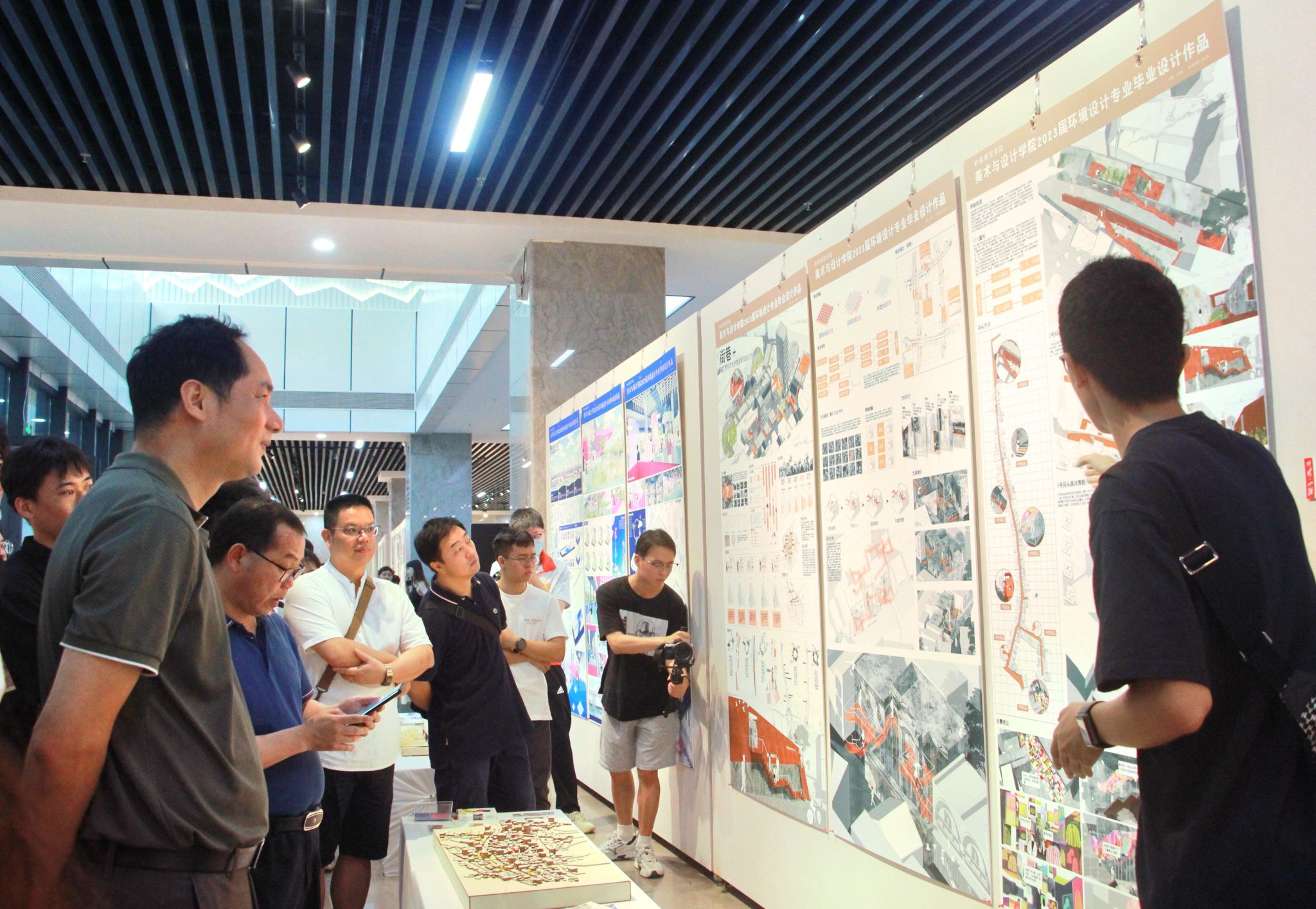 本次展览共有五个板块,紧扣国家政策和结合地方特色,以室内和景观设计为主,不止于空间结构形态的表达,更是有关空间如何演绎、如何讲述故事、如何回应社会环境问题的方法。“城市景观”板块有对湛江桥底空间改造、滨水景观、概念建筑景观、户外空间、口袋公园、主题公园进行设计,通过城市不同类型的景观研究设计,探索提升湛江城市品质的途径;“遗产保护与更新”板块主要对城市历史街区、工业遗产空间、旧市场与历史渡口进行更新改造,例如湛江赤坎老街微更新改造设计的课题项目等;“老旧社区改造”板块关注湛江城市老旧社区未来发展的可能和如何介入艺术来激活旧社区的生命力,在湛江厂区宿舍区景观改造设计中提出了共用—共享—共同的概念;乡村振兴设计”板块毕业生分别选择自己家乡作为设计的对象,熟悉的生活空间为设计构想提供了基础,而设计策略不仅回应如何留住“乡愁”,也助力乡村振兴。
