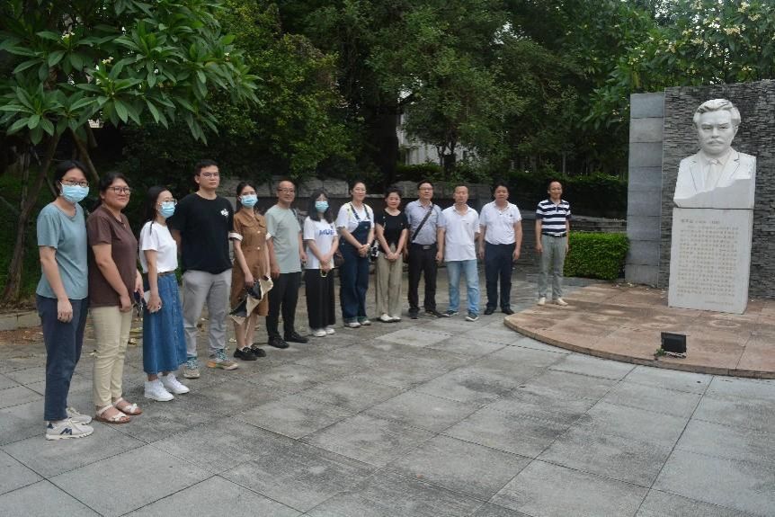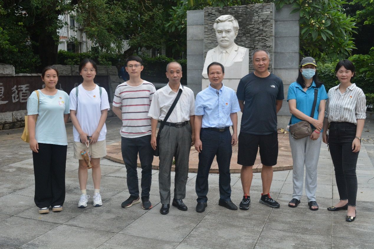 在学校谭平山纪念园,全体党员驻足瞻仰着谭平山雕像,追忆这位红色校史典范人物的丰功伟绩,学习和传承谭平山的革命精神和崇高品质。历史系教工党支部书记陈国威博士向党员同志们报告了他承担的红色校史文化研究课题的最新研究成果和进展,并详细讲述了谭平山的革命事迹。党员们纷纷表示,要在校史人物的故事中汲取前进的力量,继承和发扬革命前辈光荣传统,锤炼忠诚干净担当的政治品格。