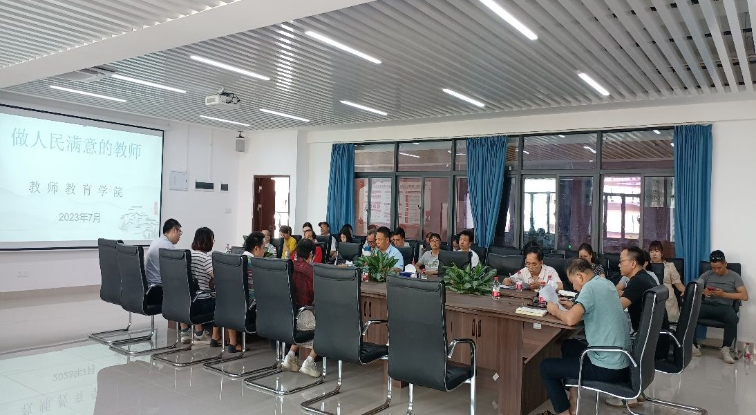 为持续推进学习贯彻习近平新时代中国特色社会主义思想主题教育,引导党员教师立德树人,7月5日下午,教师教育学院党总支召开师德师风专题集中学习会。会议由学院党总支书记练有扬主持,学院领导班子成员、各部室中心负责人及教职员工参加了会议。