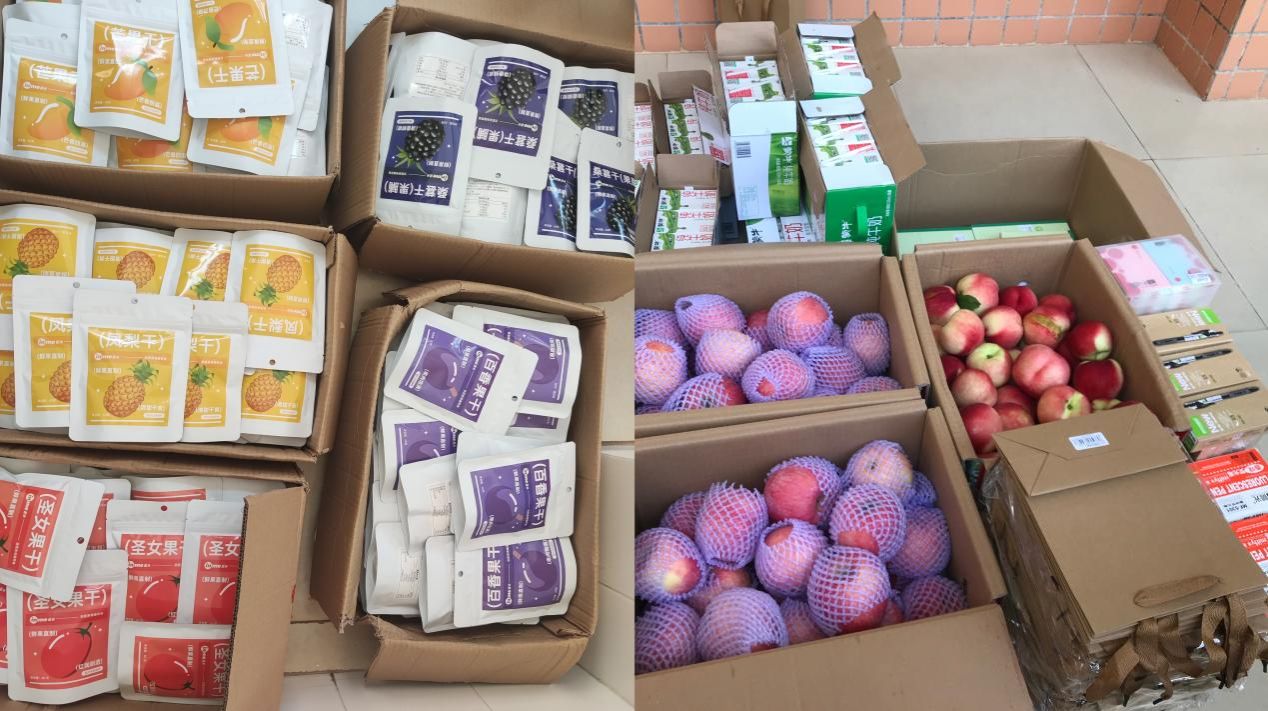 随后,领导们给各位毕业生送上慰问品,还专门把学院最新参与研发的热带水果果干零食拿来分发给同学们品尝。