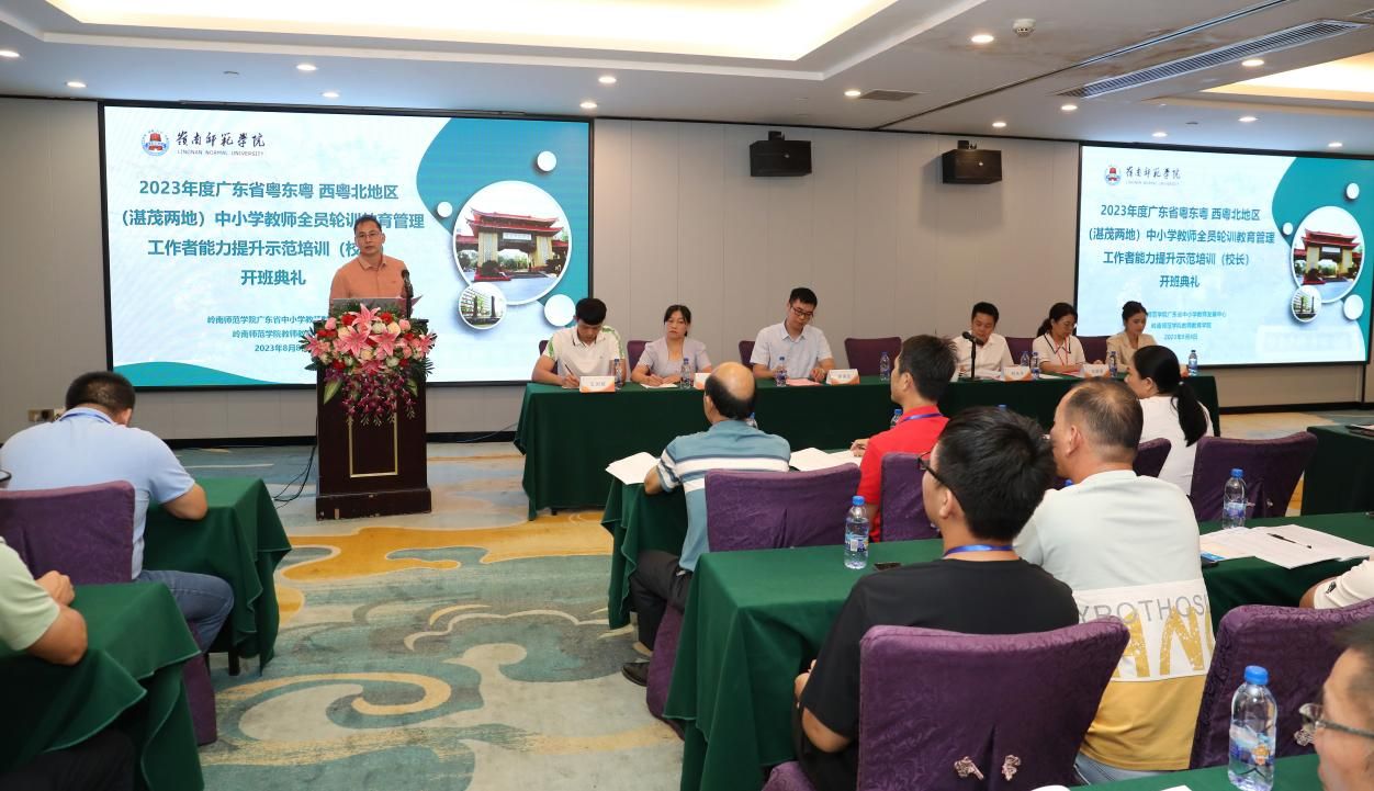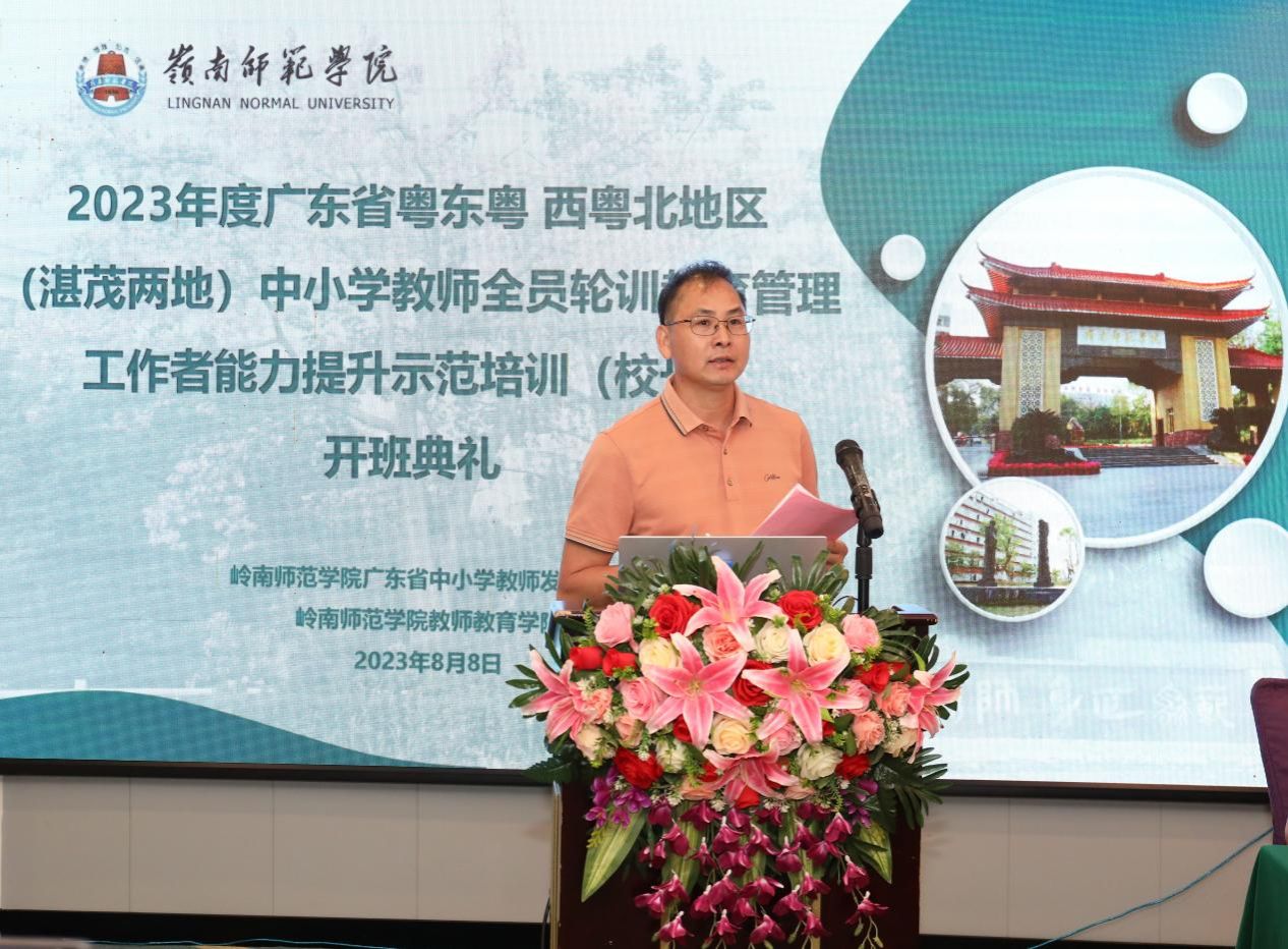 8月8日下午,2023年广东省粤东粤西粤北地区(湛茂两地)中小学教师全员培训——教育管理工作者能力提升示范培训(校长)项目于湛江市环球国际酒店二楼百合厅举行开班典礼。岭南师范学院教师教育学院副院长(主持行政全面工作)王林发出席本次开班典礼并作讲话。