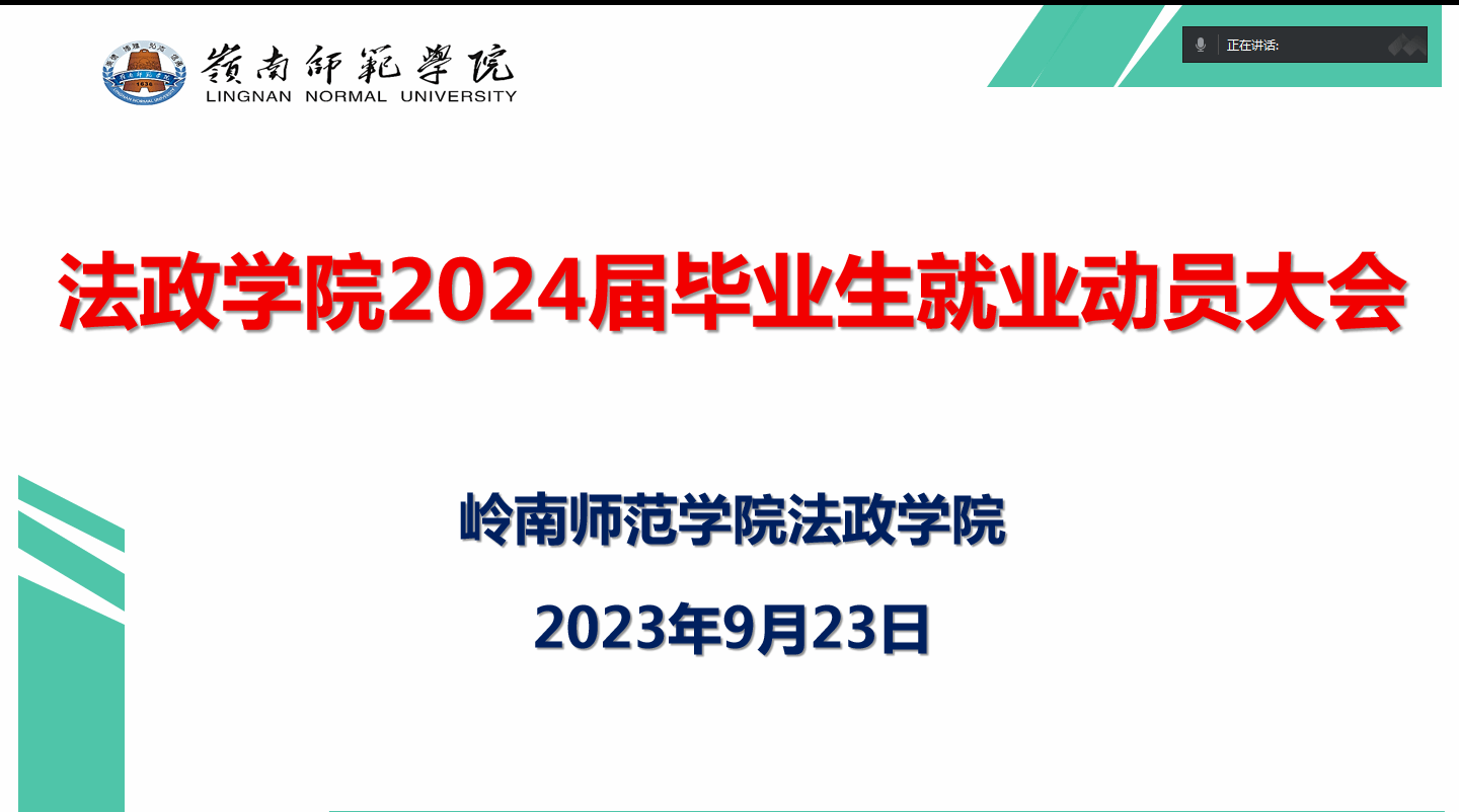 9月23日上午,法政学院在线上召开2024届毕业生就业动员大会,旨在扎实推进学院2024届毕业生就业指导与服务工作,帮助毕业生了解就业形势,把握就业机会,做好就业与职业规划。法政学院党委书记李德深、副书记易贤出席本次会议,辅导员赵欢、2024届毕业班班主任和全体毕业生参加会议,会议由辅导员赵欢主持。