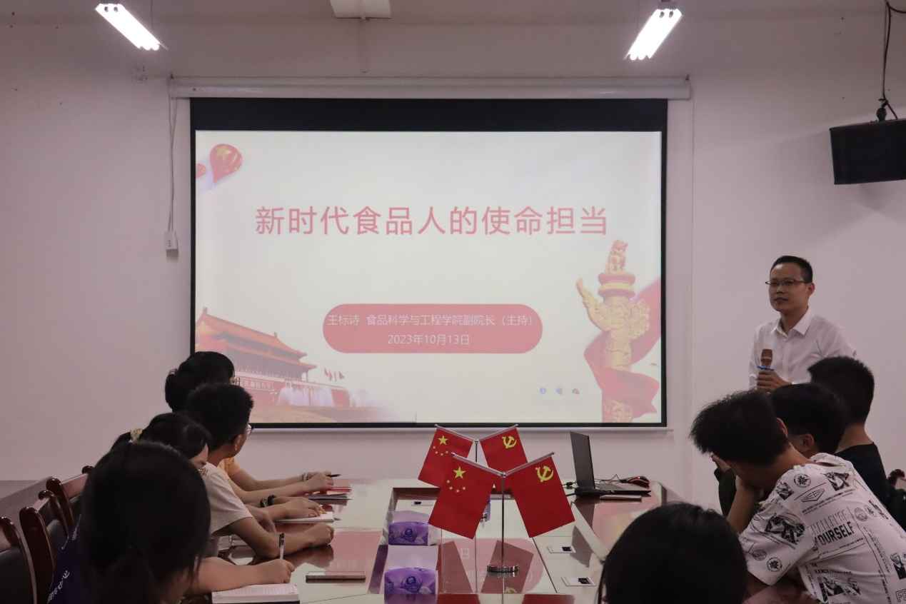 10月13日上午,食品科学与工程学院副院长王标诗(主持行政全面工作)于第五教学楼b栋318室围绕主题《新时代食品人的使命担当》开讲思政第一课,详细阐述健康中国战略与食品产业发展相关意义,并最后指出新时代食品人应有的使命与担当。出席本次活动的有辅导员袁嘉渝及23级食科班学生。