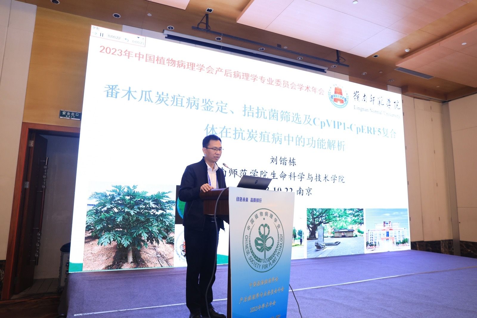 为了促进我院相关研究良性发展,加强学术交流,促进科技创新和人才成长,生科院院长刘锴栋教授以及热带园艺作物病理研究团队张鸿雁教授、吴天利博士赴江苏南京参加会议。刘锴栋教授在会议上做了“番木瓜炭疽病鉴定、拮抗菌筛选及CpVIP1-CpERF5复合体在抗炭疽病中的功能解析”的专题报告。张鸿雁教授和吴天利博士与参会单位人员开展了热带园艺作物产后病理学研究方面的交流。